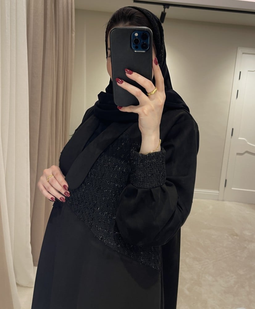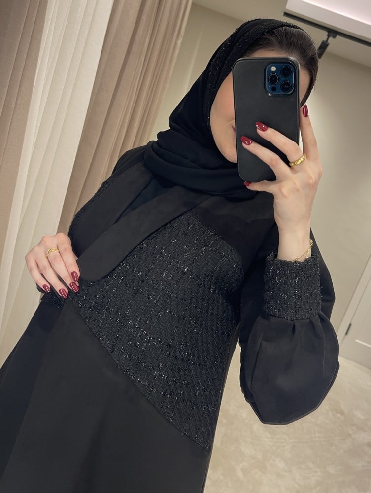 -عباية شتوية أنيقة بقماش شموا أسود، مُزينة بقماش شانيل أسود بلمعة.