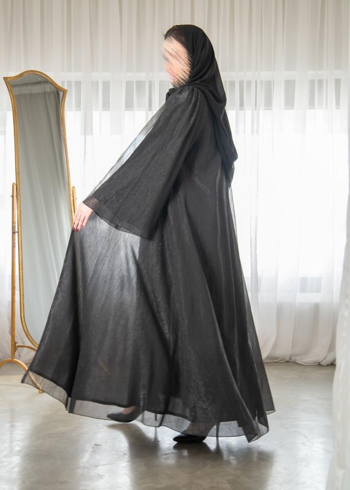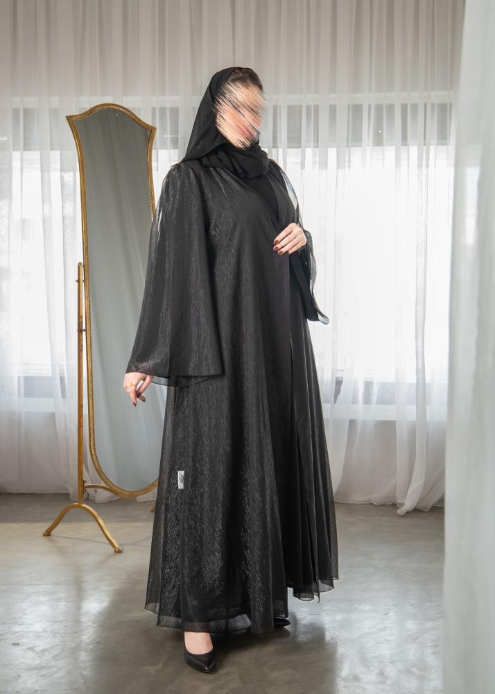 -عباية أنيقة بقماش شيفون بلمعة أسود و ومبطن بشيفون سادة، قصتها نص كلوش.