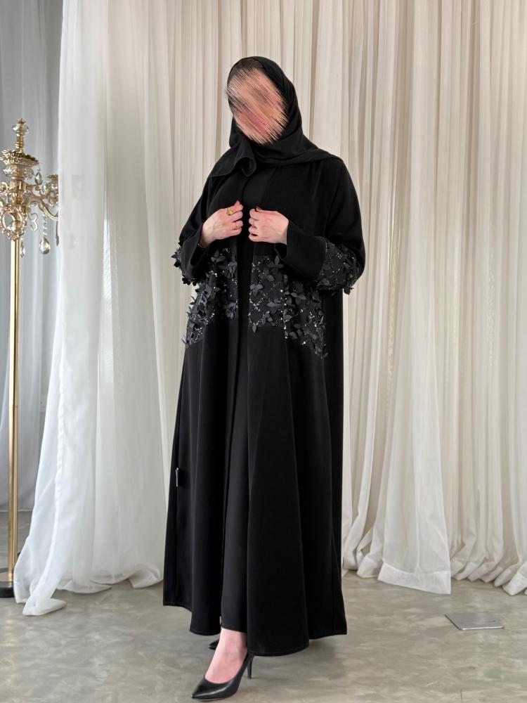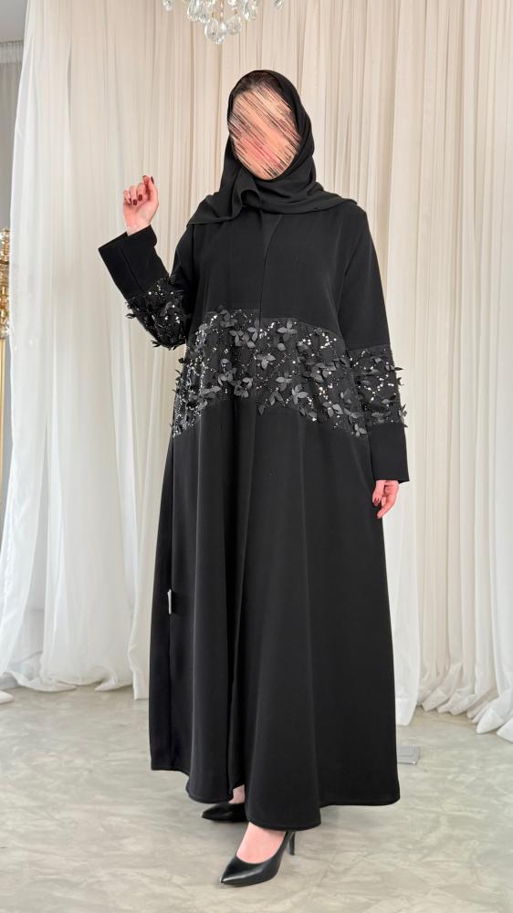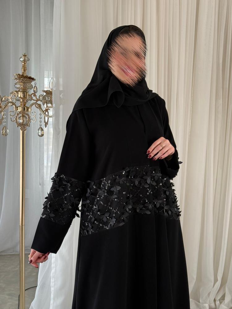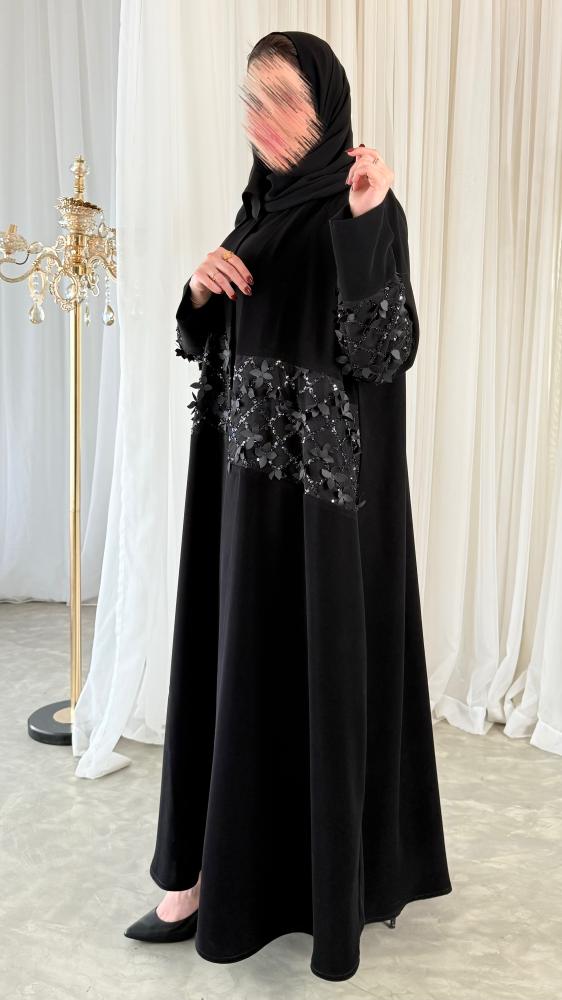 -عباية أنيقة بقماش كريب سيراميك واقف بلون أسود، قصتها ربع كلوش.