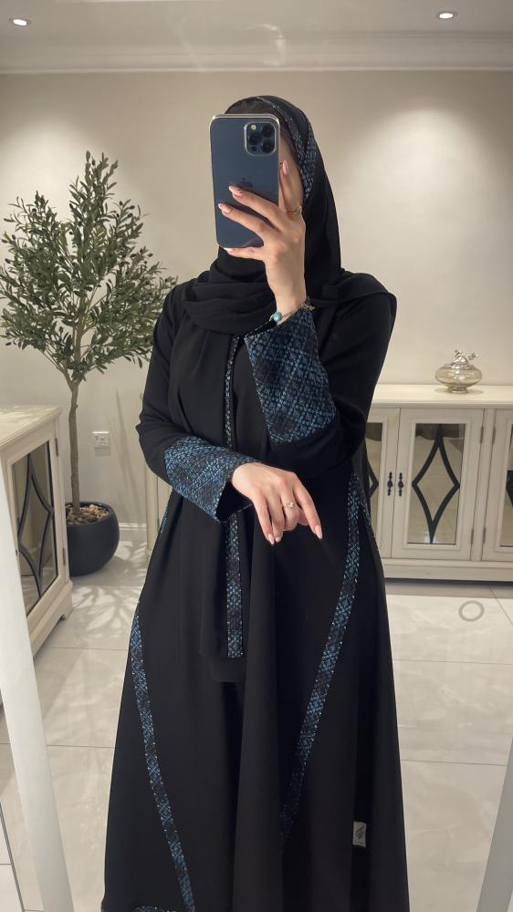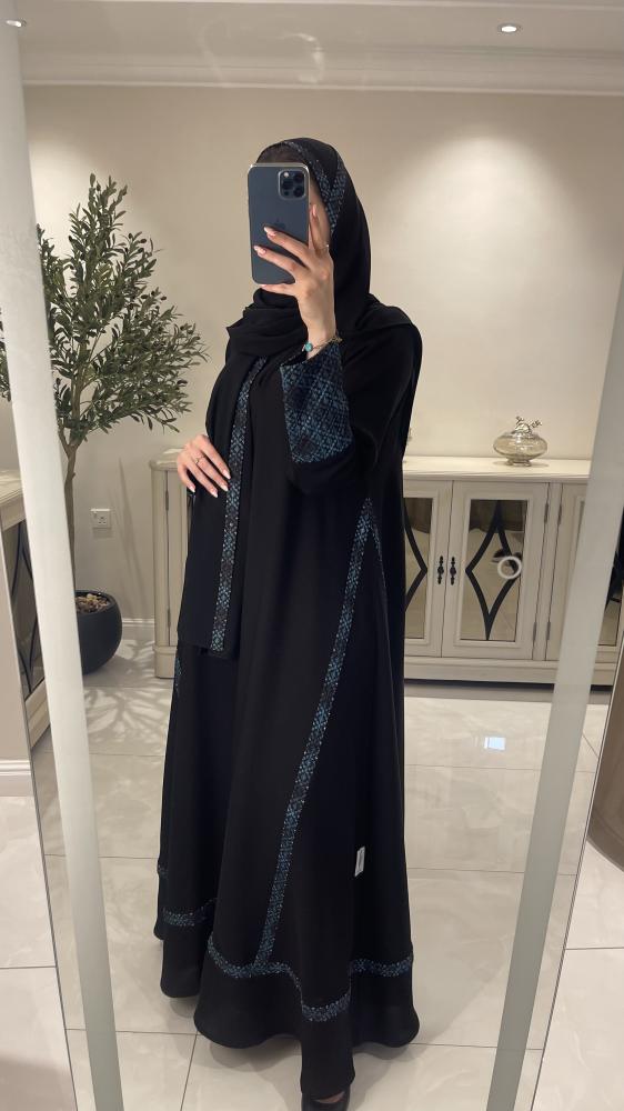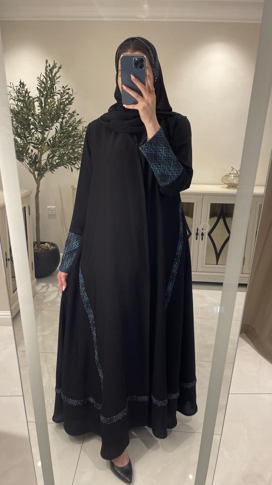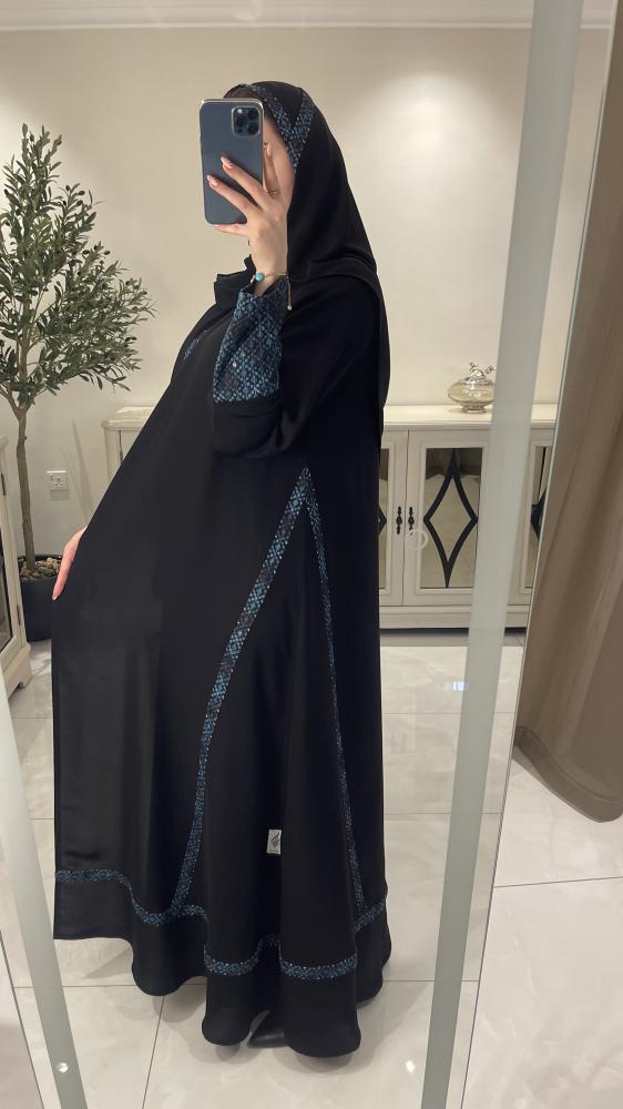 عباية صيفيه بقماش كريب المستقبل و مُزينة بركامة زرقاء، قصتها ربع كلوش.
