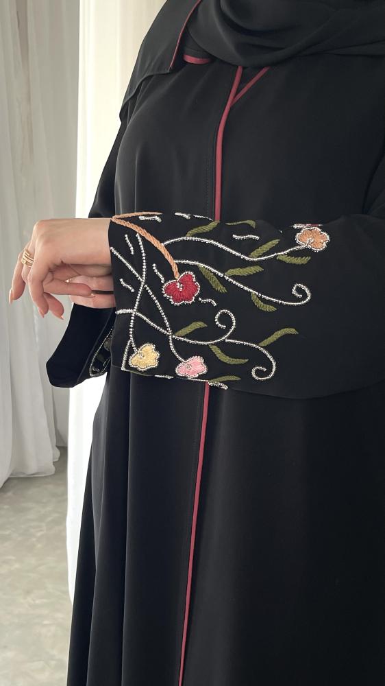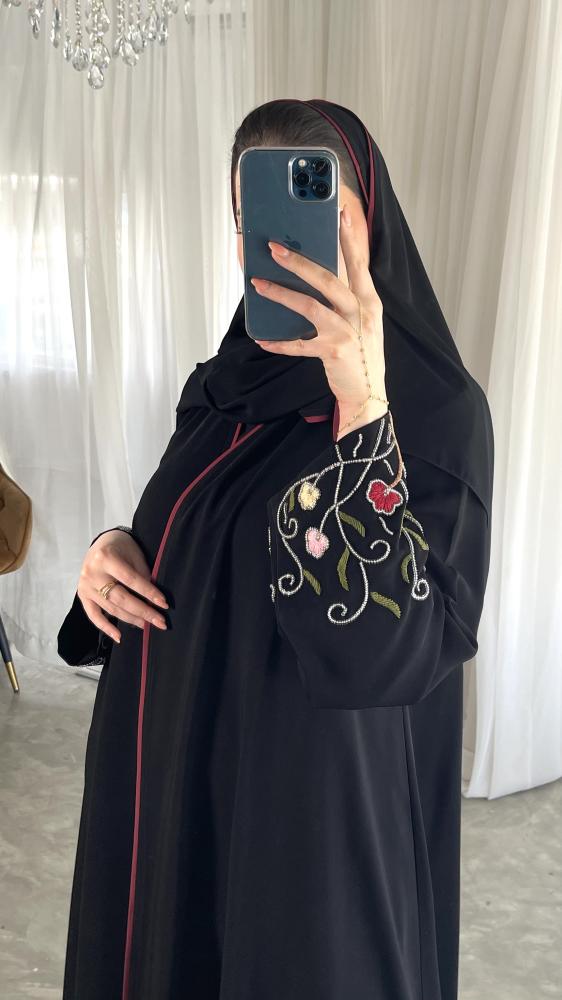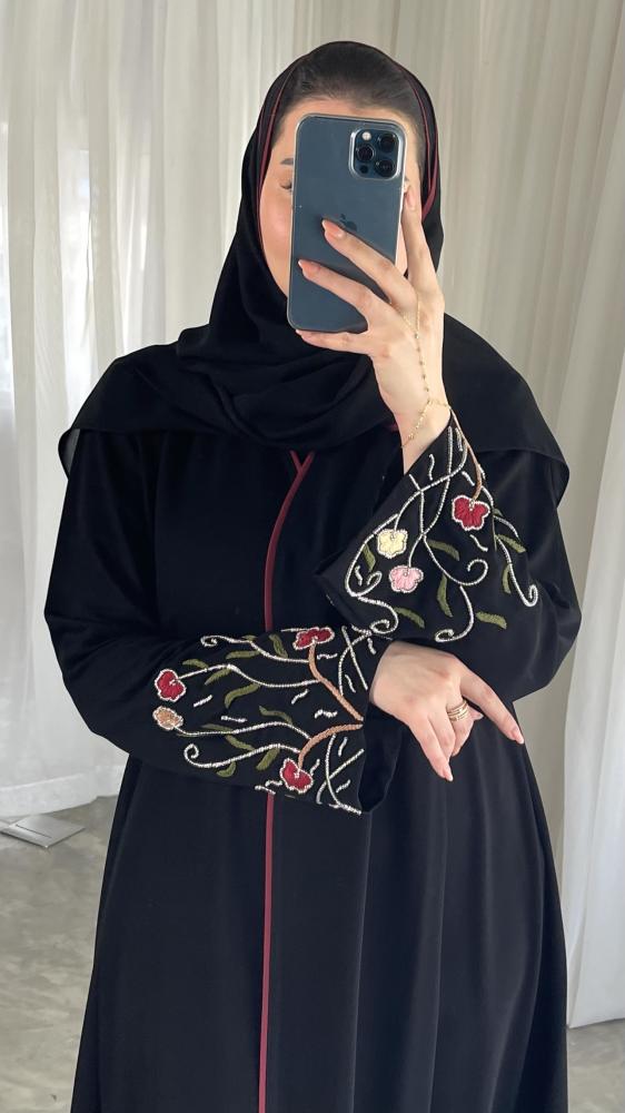 عباية أنيقة جداً بقماش كريب كوبرا ، مشغولة بتطريز يدوي من الخيوط و الخرز، قصتها نص كلوش.