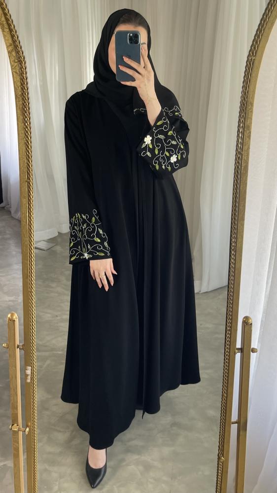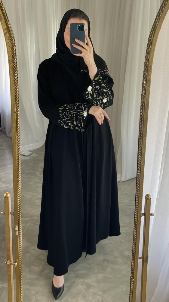 عباية أنيقة جداً بقماش كريب كوبرا ، مشغولة بتطريز يدوي من الخيوط و الخرز، قصتها نص كلوش.
