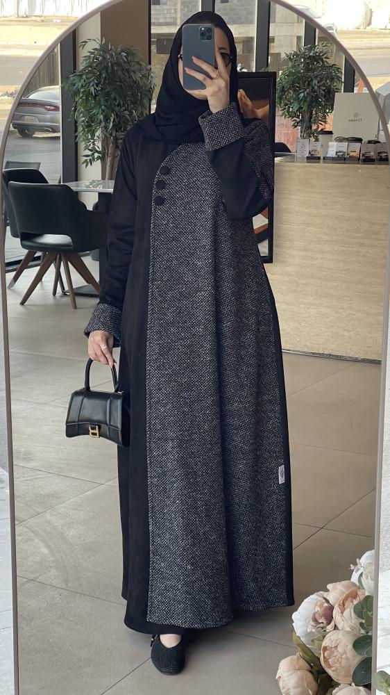 -عباية شتوية قماشها شاموا أسود و صوف رمادي، قصتها ربع كلوش.