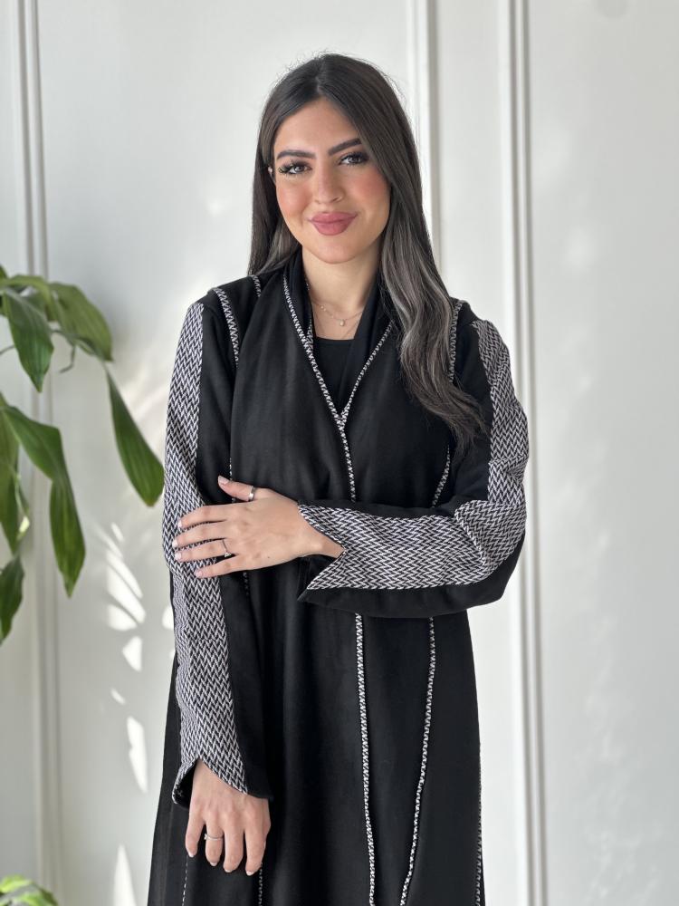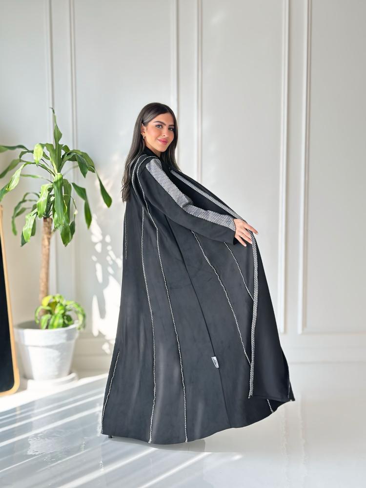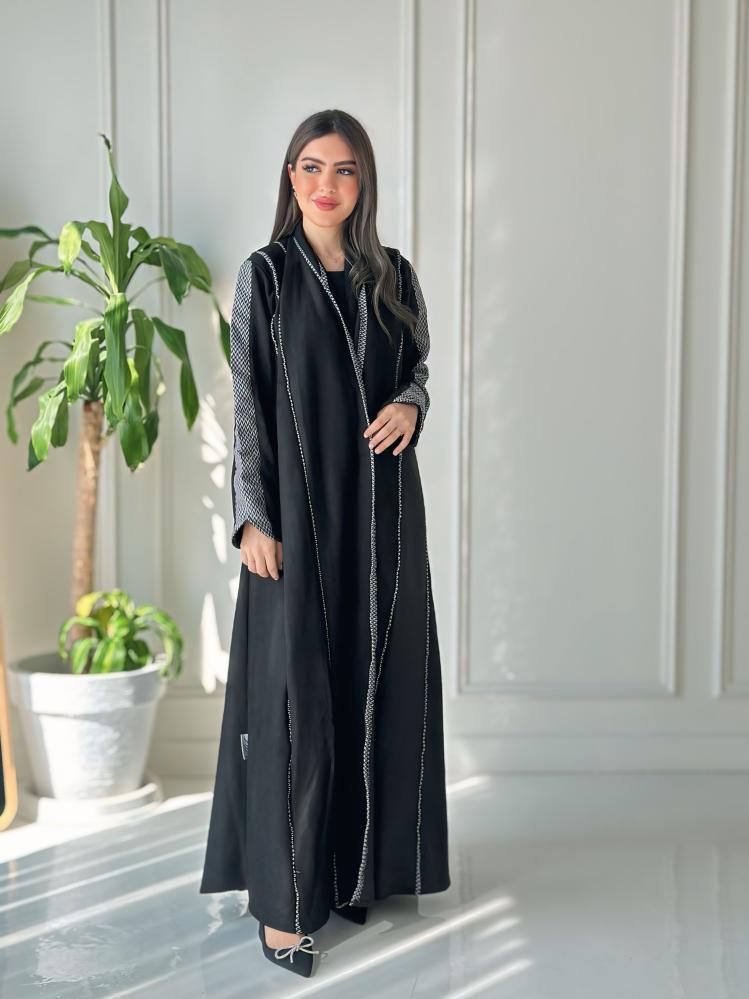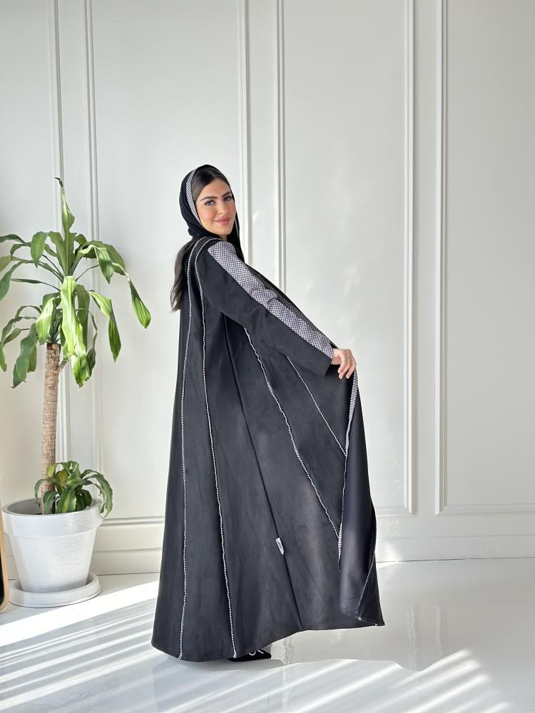 -Elegant abaya in black crepe minaite fabric and grey Indian patterned taffeta, quarter-flare cut.